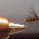 De Fintvlieg7. Wikkel de veer 3 keer achter de kraal en zet hem vast met binddraad. Hierna afbinden en klaar is de Fintvlieg.