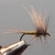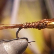 Stap 4:Wikkel met het restant van de fazanten fibers een lijfje en bind dit af achter de thorax. Wikkel met het koperdraadje een ribbing(4 of 5 slagen) kruislings over de fazantenfibers en bind dit af achter de thorax.